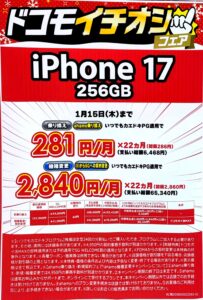 2025/12/28 Docomoの「いつでもカエドキプログラム」でiPhone17がお安くなっていました
