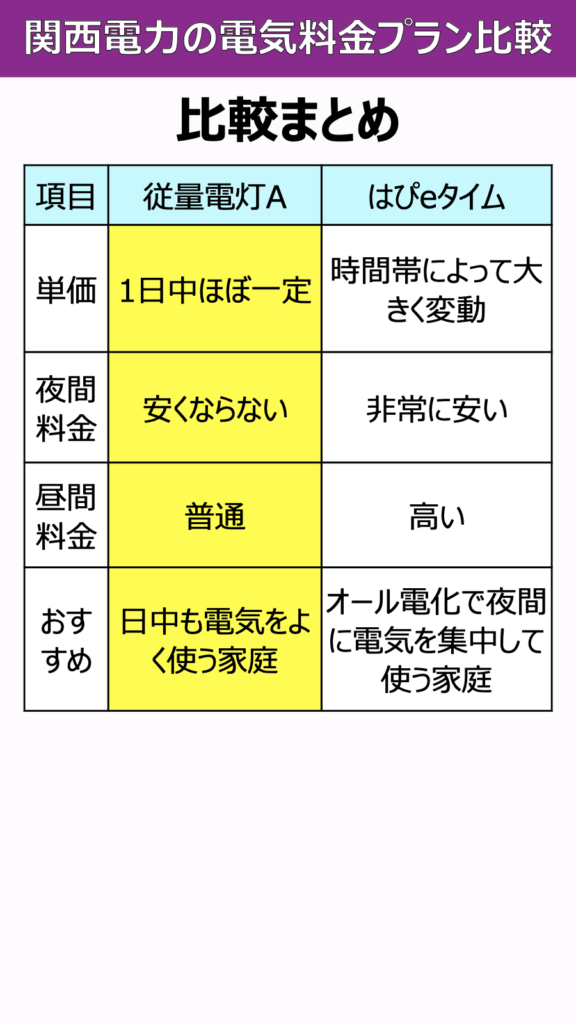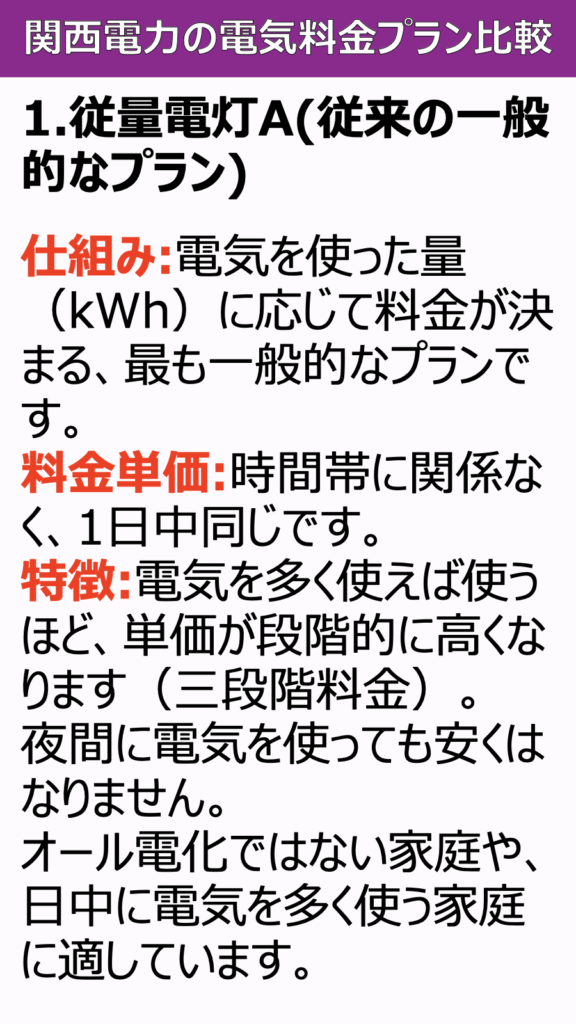 関西電力には、大きく分けて「使った分だけ同じ単価で払うプラン」と、「時間帯によって単価が変わるプラン」があります。