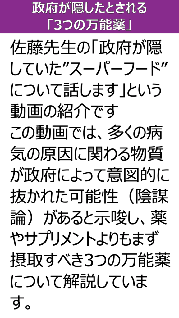 この動画では、多くの病気の原因に関わる物質が政府によって意図的に抜かれた可能性(陰謀論)があると示唆し、薬やサプリメントよりもまず摂取すべき3つの万能薬について解説しています。
