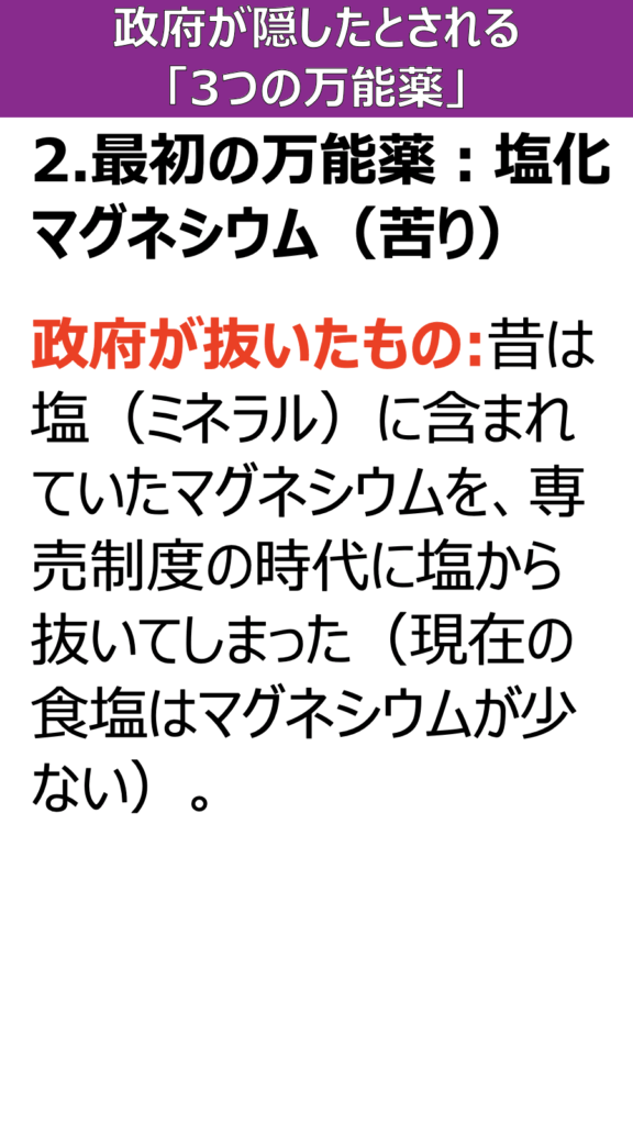 政府が抜いたもの:昔は塩(ミネラル)に含まれていたマグネシウムを、専売制度の時代に塩から抜いてしまった(現在の食塩はマグネシウムが少ない)。