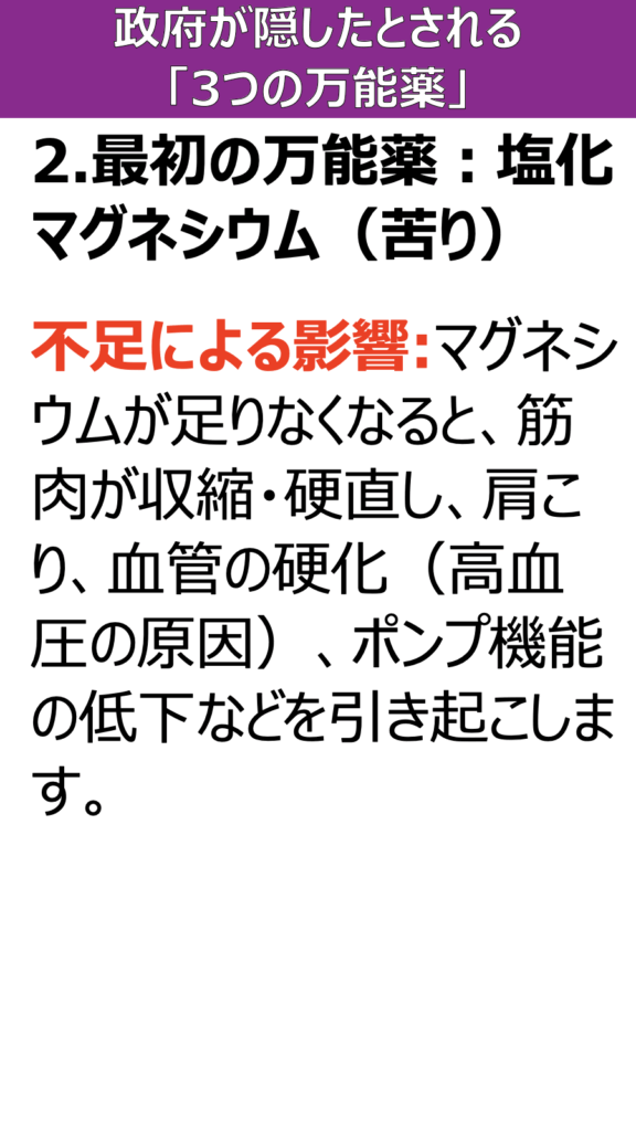 不足による影響:マグネシウムが足りなくなると、筋肉が収縮・硬直し、肩こり、血管の硬化(高血圧の原因)、ポンプ機能の低下などを引き起こします。