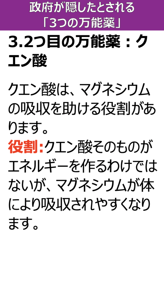 役割:クエン酸そのものがエネルギーを作るわけではないが、マグネシウムが体により吸収されやすくなります。