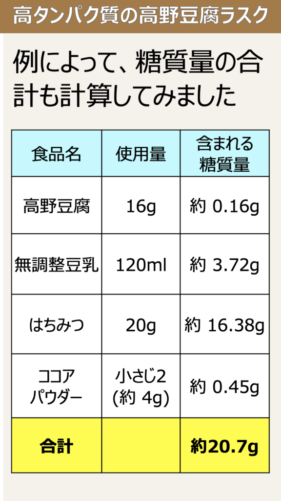 このレシピの中で、こうやどうふの糖質はほぼゼロですが、糖質の大半を占めているのははちみつです。