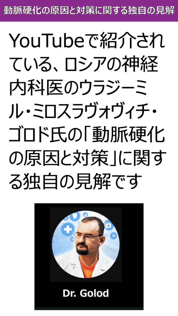 YouTubeで紹介されている、ロシアの神経内科医のウラジーミル・ミロスラヴォヴィチ・ゴロド氏の「動脈硬化の原因と対策」に関する独自の見解です