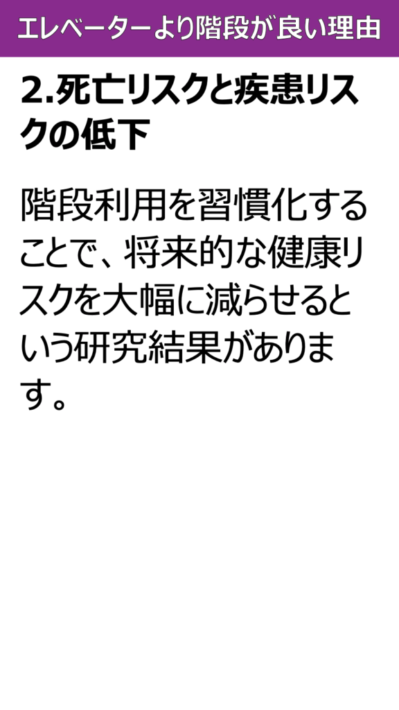 階段利用を習慣化することで、将来的な健康リスクを大幅に減らせるという研究結果があります。