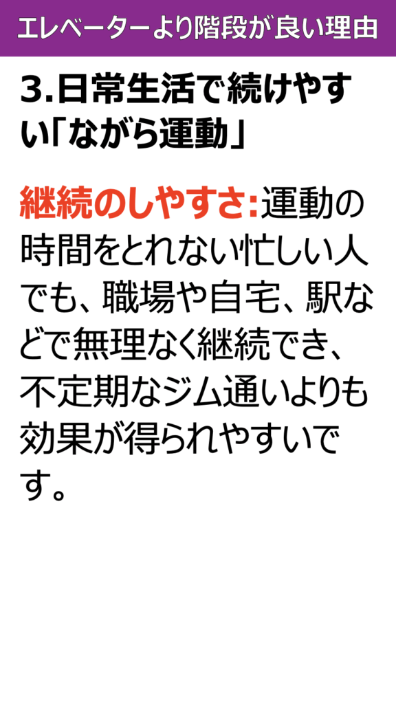 継続のしやすさ:運動の時間をとれない忙しい人でも、職場や自宅、駅などで無理なく継続でき、不定期なジム通いよりも効果が得られやすいです。