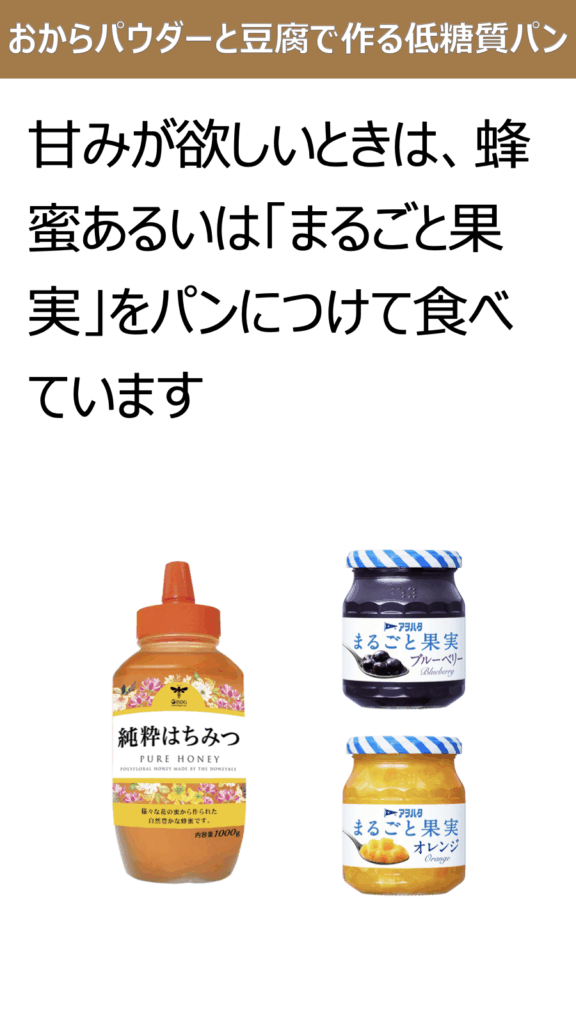 甘みが欲しいときは、蜂蜜あるいは「まるごと果実」をパンにつけて食べています