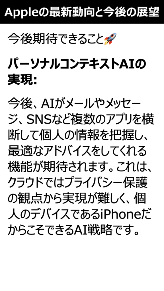 パーソナルコンテキストAIの実現:今後、AIがメールやメッセージ、SNSなど複数のアプリを横断して個人の情報を把握し、最適なアドバイスをしてくれる機能が期待されます。これは、クラウドではプライバシー保護の観点から実現が難しく、個人のデバイスであるiPhoneだからこそできるAI戦略です。