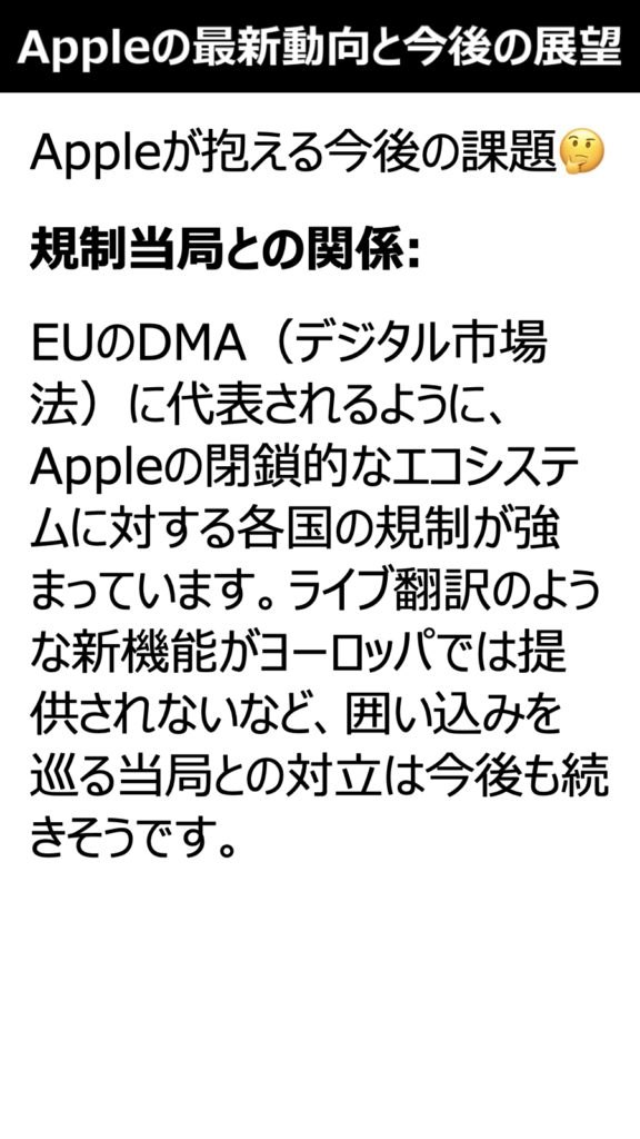 規制当局との関係:EUのDMA(デジタル市場法)に代表されるように、Appleの閉鎖的なエコシステムに対する各国の規制が強まっています。ライブ翻訳のような新機能がヨーロッパでは提供されないなど、囲い込みを巡る当局との対立は今後も続きそうです。