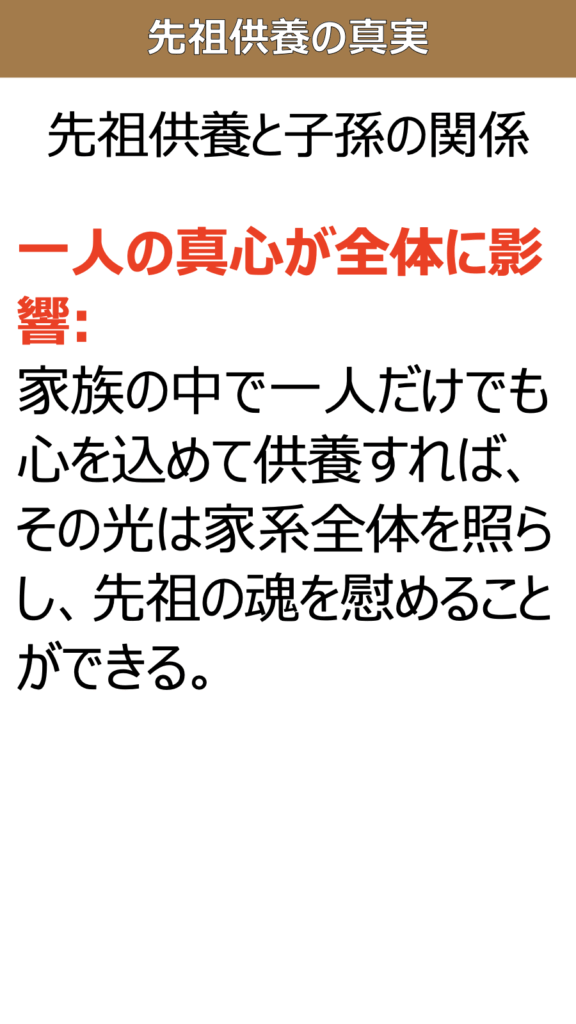 一人の真心が全体に影響:家族の中で一人だけでも心を込めて供養すれば、その光は家系全体を照らし、先祖の魂を慰めることができる。