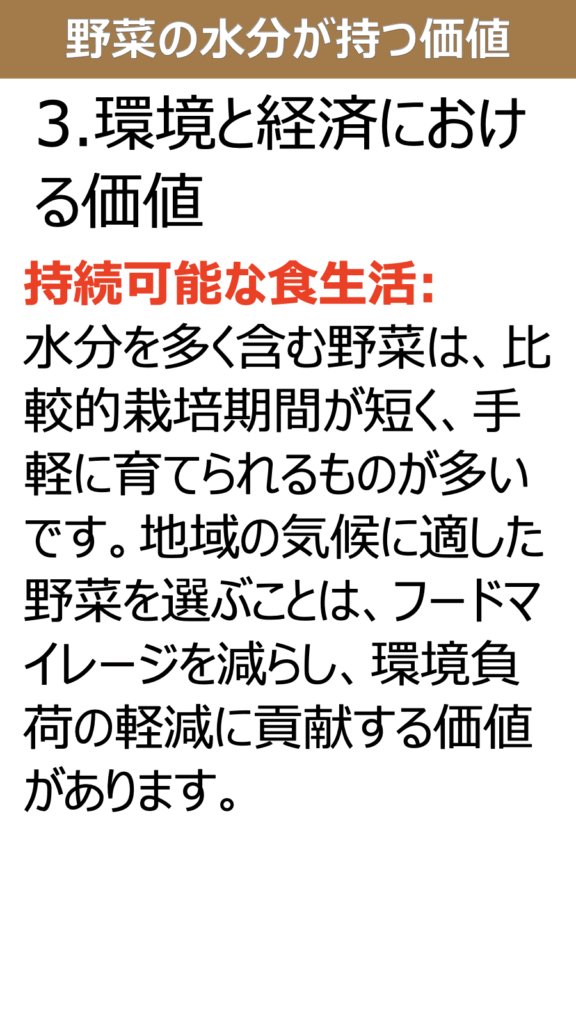 持続可能な食生活:水分を多く含む野菜は、比較的栽培期間が短く、手軽に育てられるものが多いです。地域の気候に適した野菜を選ぶことは、フードマイレージを減らし、環境負荷の軽減に貢献する価値があります。