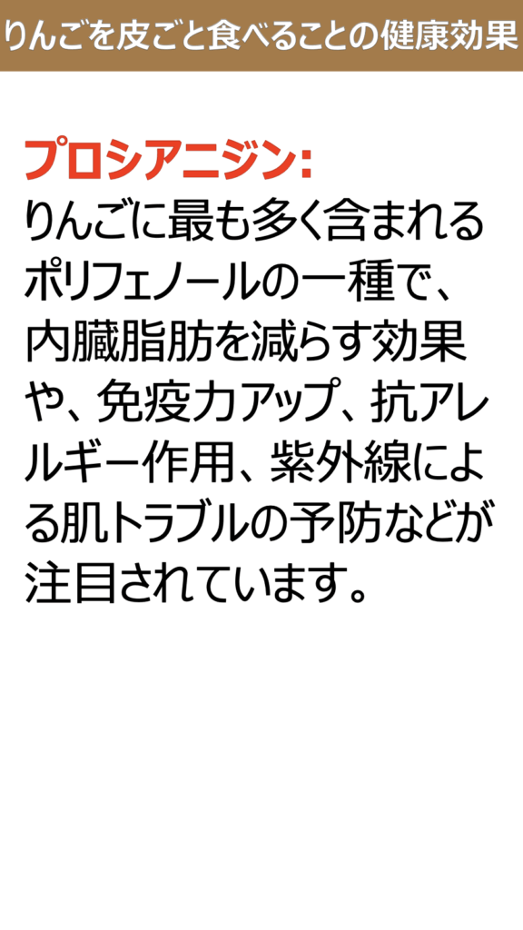 プロシアニジン:りんごに最も多く含まれるポリフェノールの一種で、内臓脂肪を減らす効果や、免疫力アップ、抗アレルギー作用、紫外線による肌トラブルの予防などが注目されています。