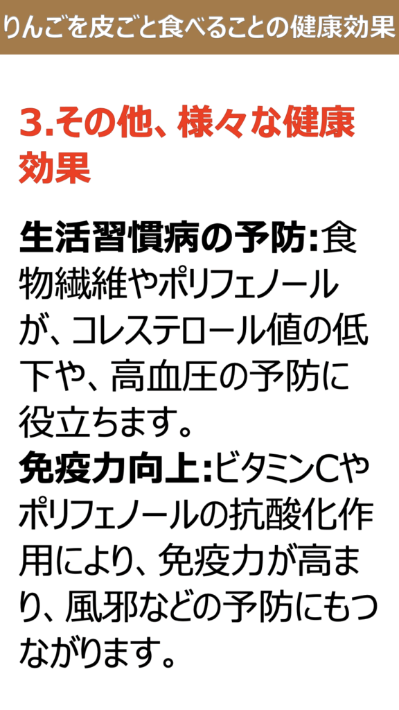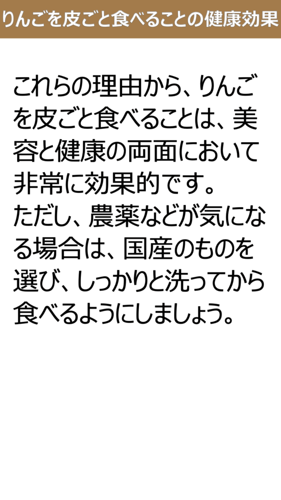 これらの理由から、りんごを皮ごと食べることは、美容と健康の両面において非常に効果的です。ただし、農薬などが気になる場合は、国産のものを選び、しっかりと洗ってから食べるようにしましょう。