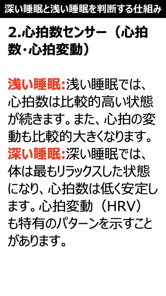 深い睡眠:深い睡眠では、体は最もリラックスした状態になり、心拍数は低く安定します。心拍変動(HRV)も特有のパターンを示すことがあります。