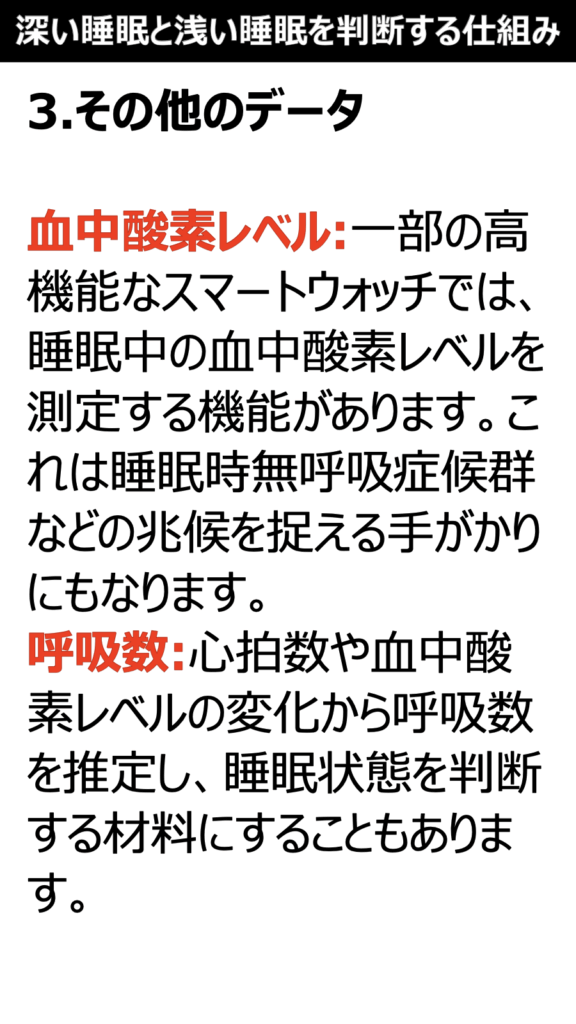 呼吸数:心拍数や血中酸素レベルの変化から呼吸数を推定し、睡眠状態を判断する材料にすることもあります。