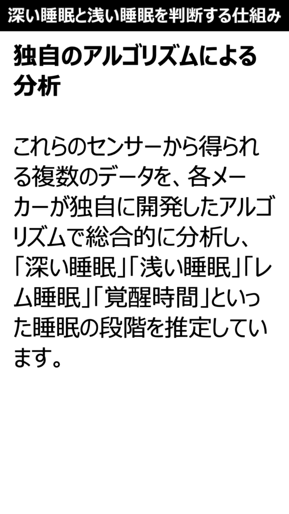 これらのセンサーから得られる複数のデータを、各メーカーが独自に開発したアルゴリズムで総合的に分析し、「深い睡眠」「浅い睡眠」「レム睡眠」「覚醒時間」といった睡眠の段階を推定しています。