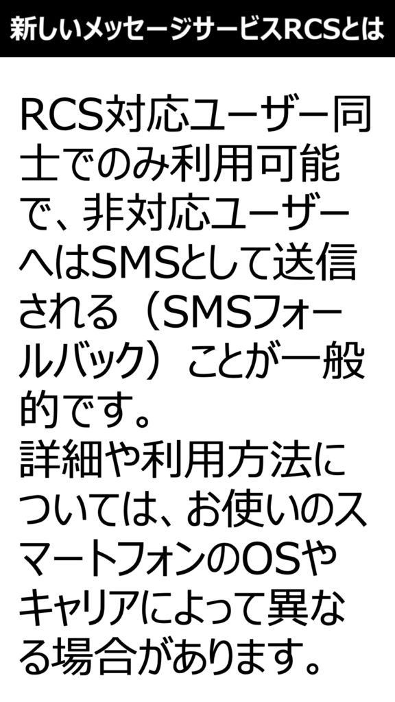 RCS対応ユーザー同士でのみ利用可能で、非対応ユーザーへはSMSとして送信される(SMSフォールバック)ことが一般的です。