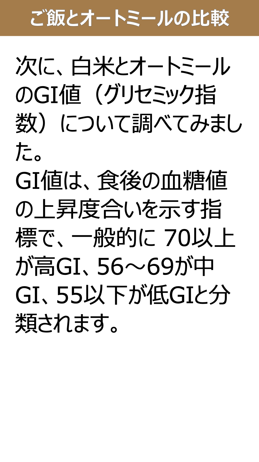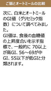 ご飯とオートミールの比較(糖質量、GI値、GL値)