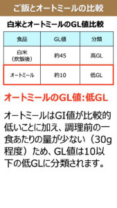 ご飯とオートミールの比較(糖質量、GI値、GL値)