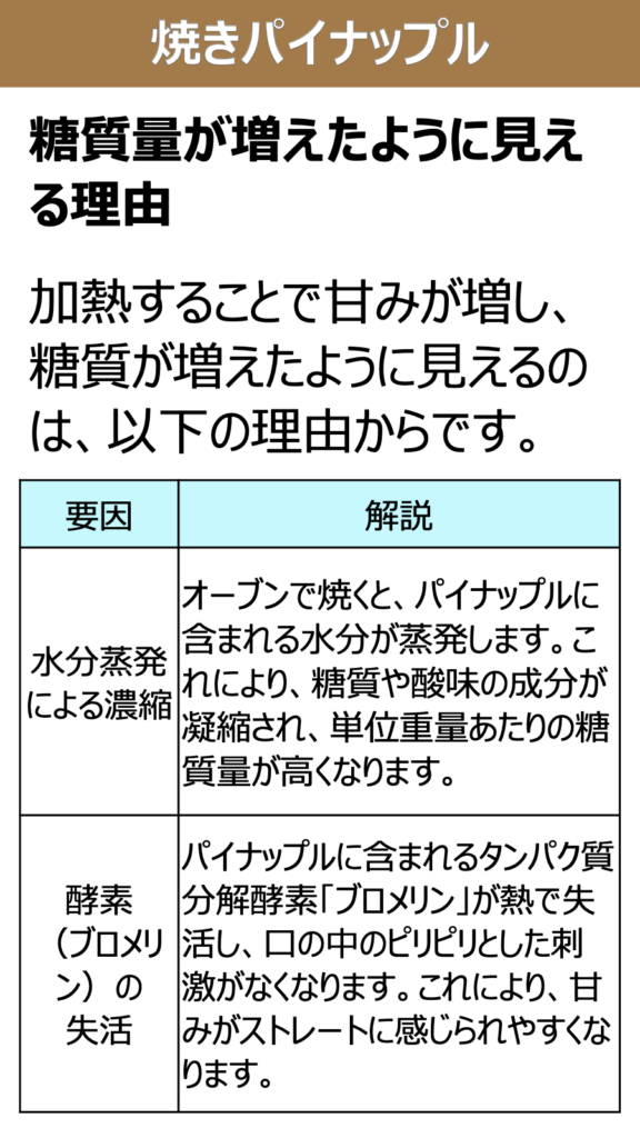 パイナップルをオーブンで焼くと甘くなるのですが、糖質量が増えたりしますか?