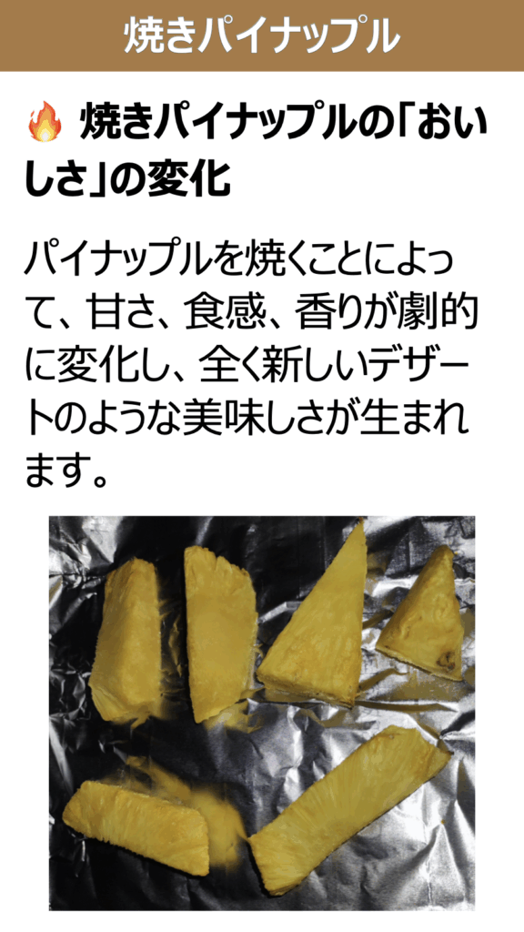 パイナップルを焼くことによって、甘さ、しょっかん、香りが劇的に変化し、全く新しいデザートのような美味しさが生まれます。