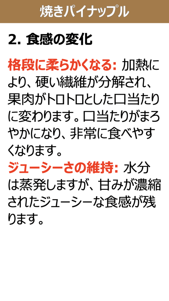 酸味・エグみが飛ぶ: 加熱により、なまのパイナップルが持つ酸味や特有のエグみ(刺激が抑えられます。