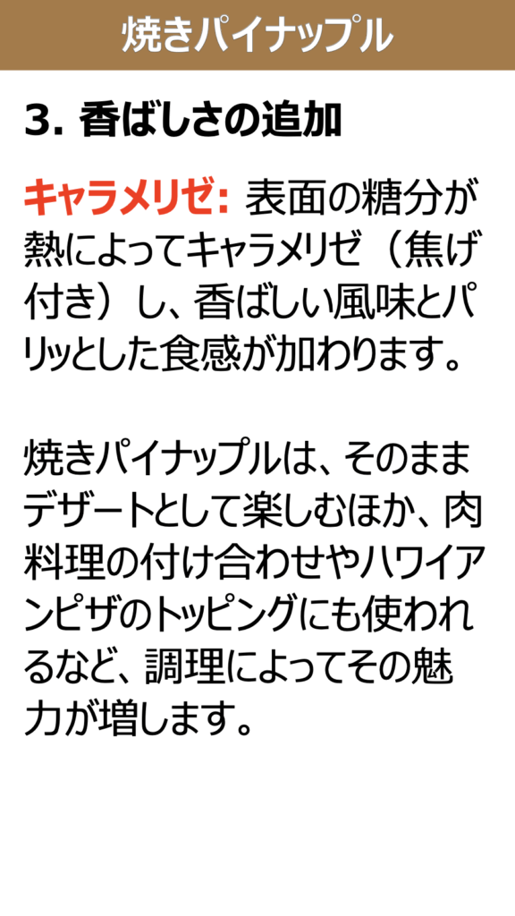 焼きパイナップルは、そのままデザートとして楽しむほか、肉料理の付け合わせやハワイアンピザのトッピングにも使われるなど、調理によってその魅力が増します。