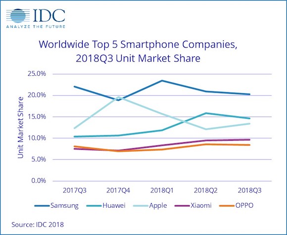 トップはサムスン、Appleと競っているのがファーウエイです