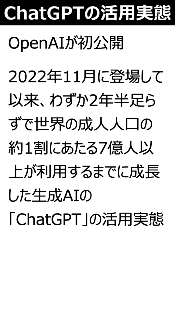 2022年11月に登場して以来、わずか2年半足らずで世界の成人人口の約1割にあたる7億人以上が利用するまでに成長した生成AIの「ChatGPTの活用実態