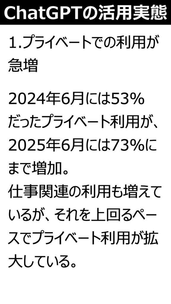 2024年6月には53%だったプライベート利用が、2025年6月には73%にまで増加。