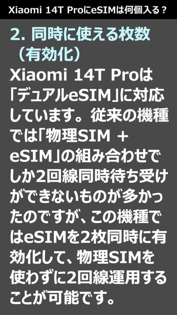 Xiaomi 14T Proは**「デュアルeSIM」に対応しています。