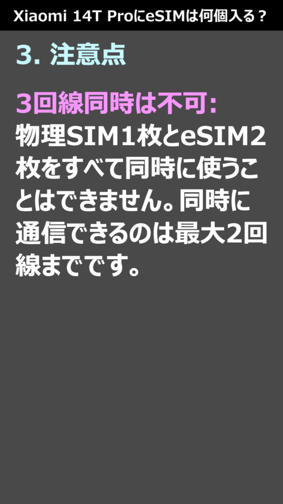 - 3回線同時は不可: 物理SIM1枚とeSIM2枚をすべて同時に使うことはできません。同時に通信できるのは最大2回線までです。