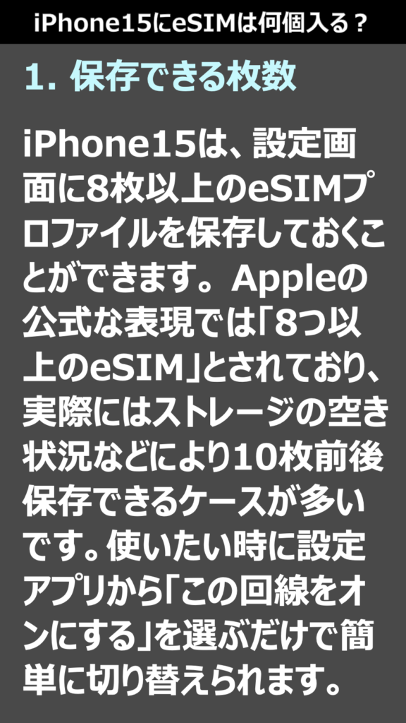 iPhone15のeSIMについては「保存できる枚数」と「同時に使える枚数」に違いがあります。
