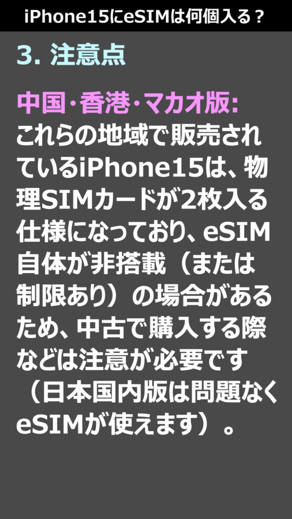 - 中国・香港・マカオ版: これらの地域で販売されているiPhone 15は、物理SIMカードが2枚入る仕様になっており、**eSIM自体が非搭載(または制限あり)**の場合があるため、中古で購入する際などは注意が必要です(日本国内版は問題なくeSIMが使えます)。