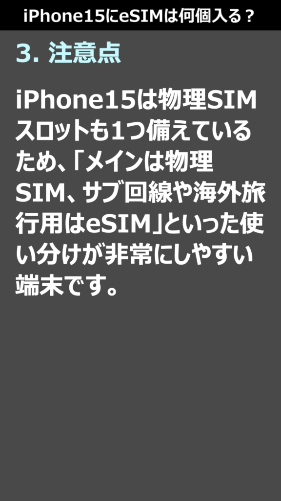 iPhone 15は物理SIMスロットも1つ備えているため、「メインは物理SIM、サブ回線や海外旅行用はeSIM」といった使い分けが非常にしやすい端末です。