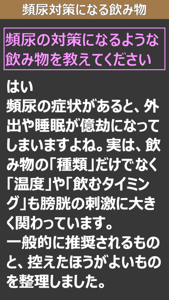 はい、頻尿の症状があると、外出や睡眠が億劫になってしまいますよね。実は、飲み物の「種類」だけでなく「温度」や「飲むタイミング」も膀胱の刺激に大きく関わっています。