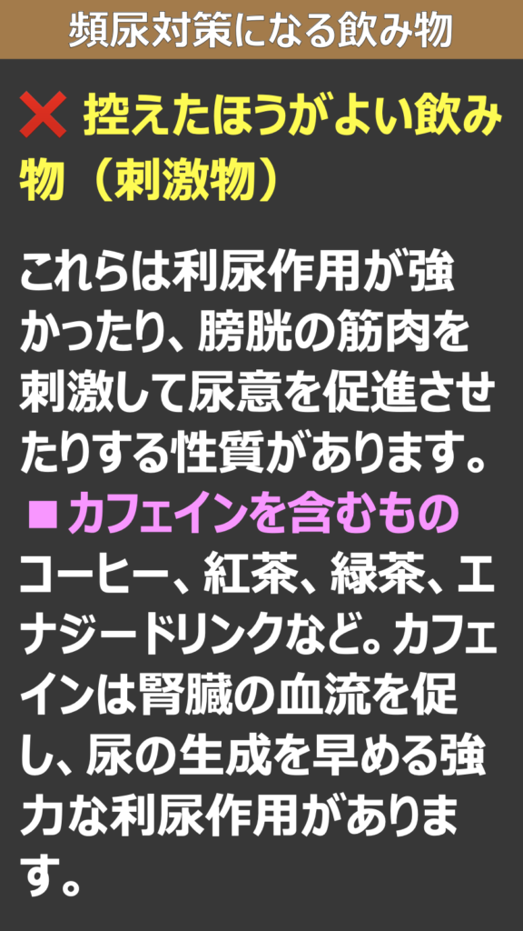 これらは利尿作用が強かったり、膀胱の筋肉を刺激して尿意を促進させたりする性質があります。