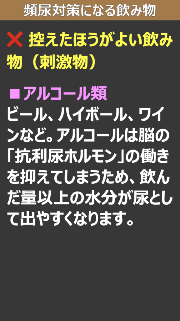 * ビール、ハイボール、ワインなど。アルコールは脳の「抗利尿ホルモン」の働きを抑えてしまうため、飲んだ量以上の水分が尿として出やすくなります。