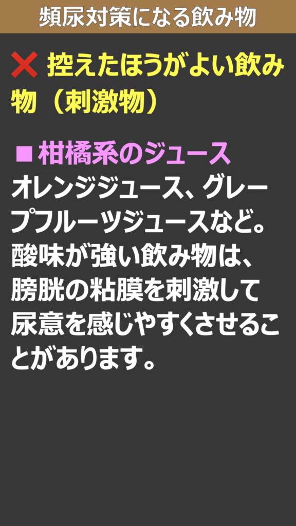 * オレンジジュース、グレープフルーツジュースなど。酸味が強い飲み物は、膀胱の粘膜を刺激して尿意を感じやすくさせることがあります。