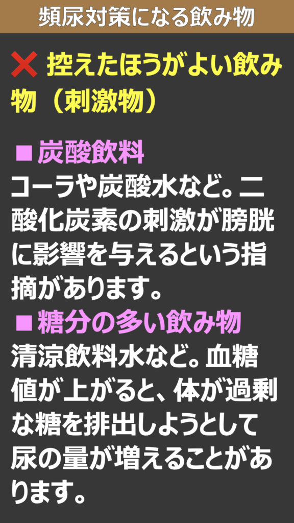 * コーラや炭酸水など。二酸化炭素の刺激が膀胱に影響を与えるという指摘があります。