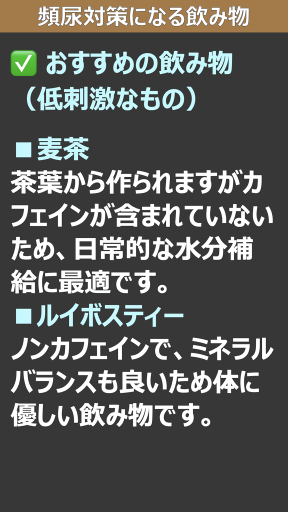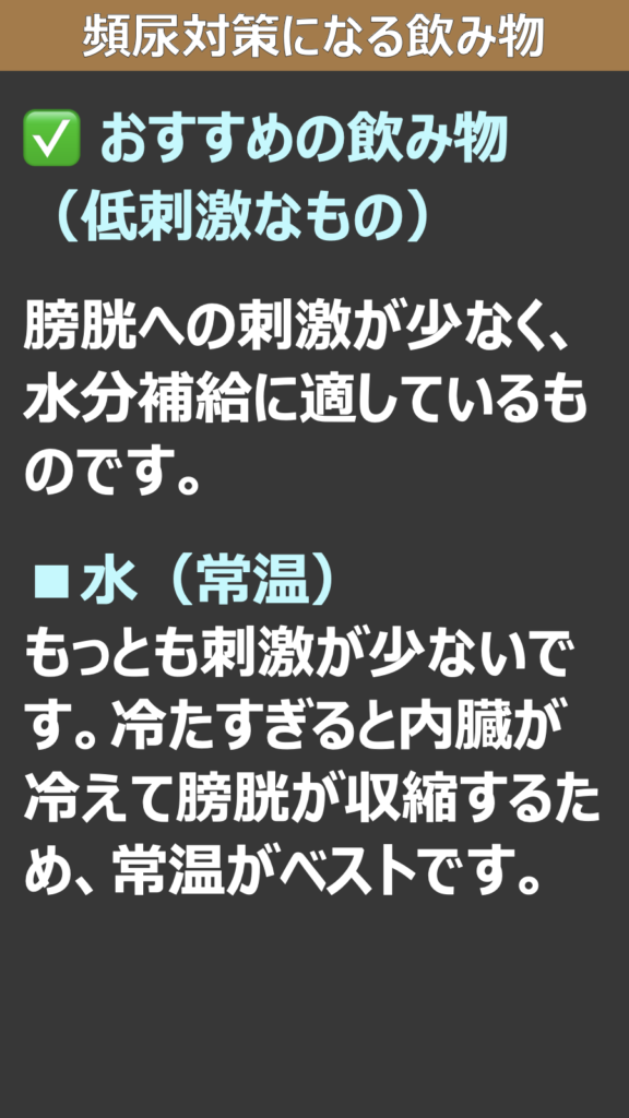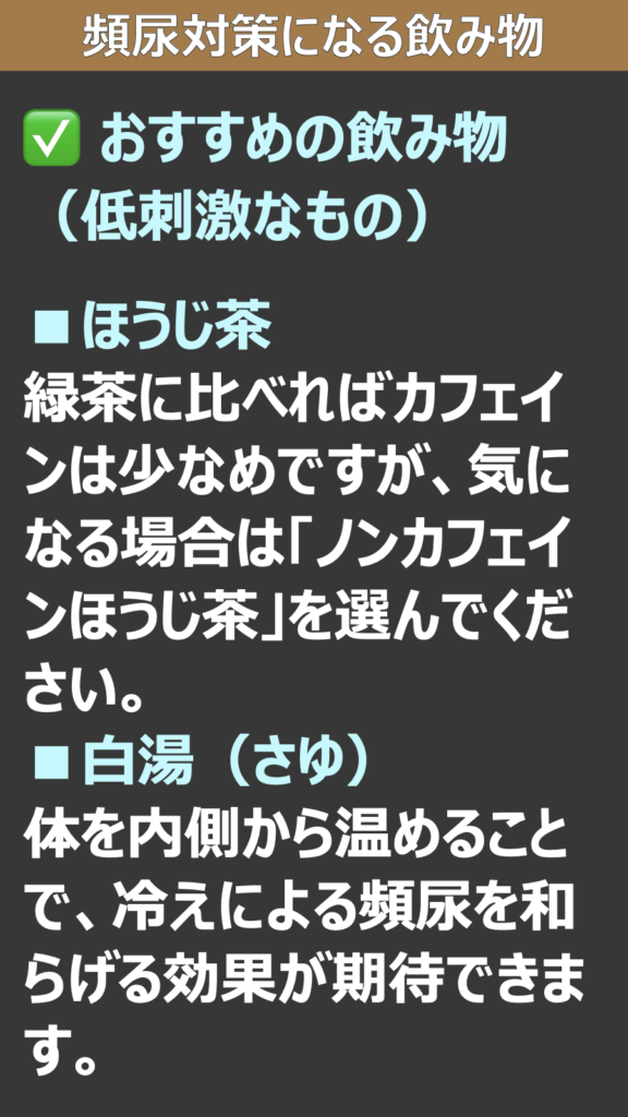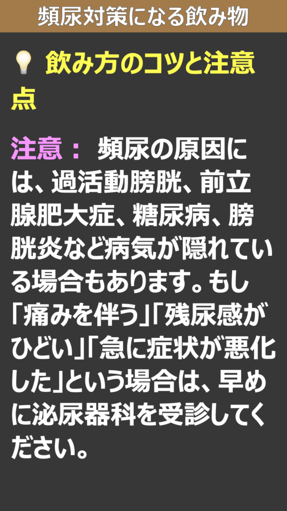 > 注意: 頻尿の原因には、過活動膀胱、前立腺肥大症、糖尿病、膀胱炎など病気が隠れている場合もあります。もし「痛みを伴う」「残尿感がひどい」「急に症状が悪化した」という場合は、早めに泌尿器科を受診してください。