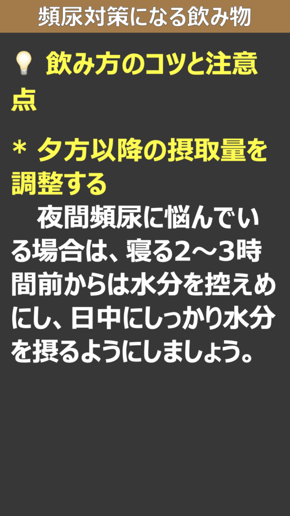 夜間頻尿に悩んでいる場合は、寝る2〜3時間前からは水分を控えめにし、日中にしっかり水分を摂るようにしましょう。