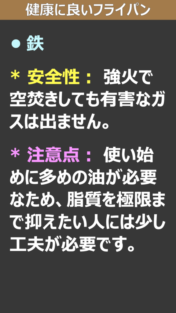 「健康に良いか」という視点でフライパンを選ぶ際、ポイントになるのは**「有害物質の発生リスク」と「栄養面へのプラス影響」**の2点です。