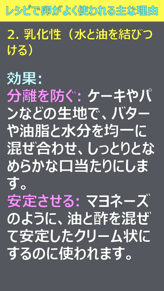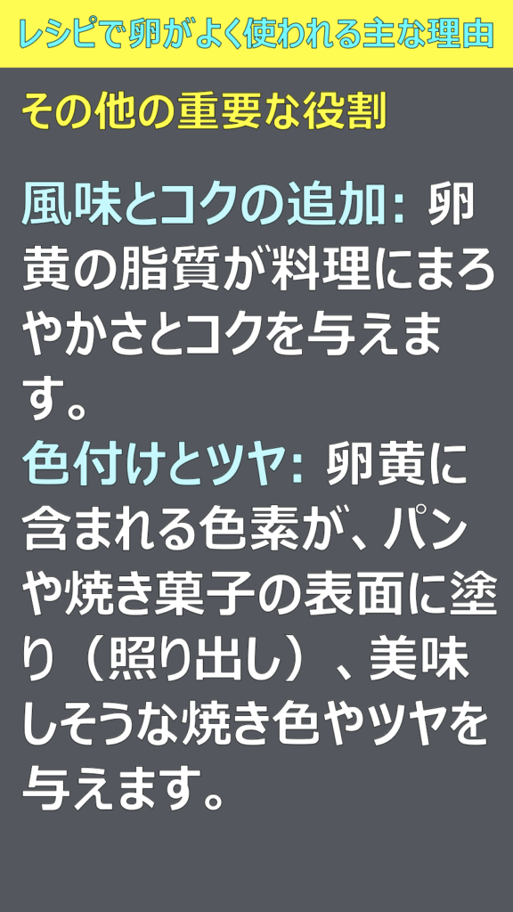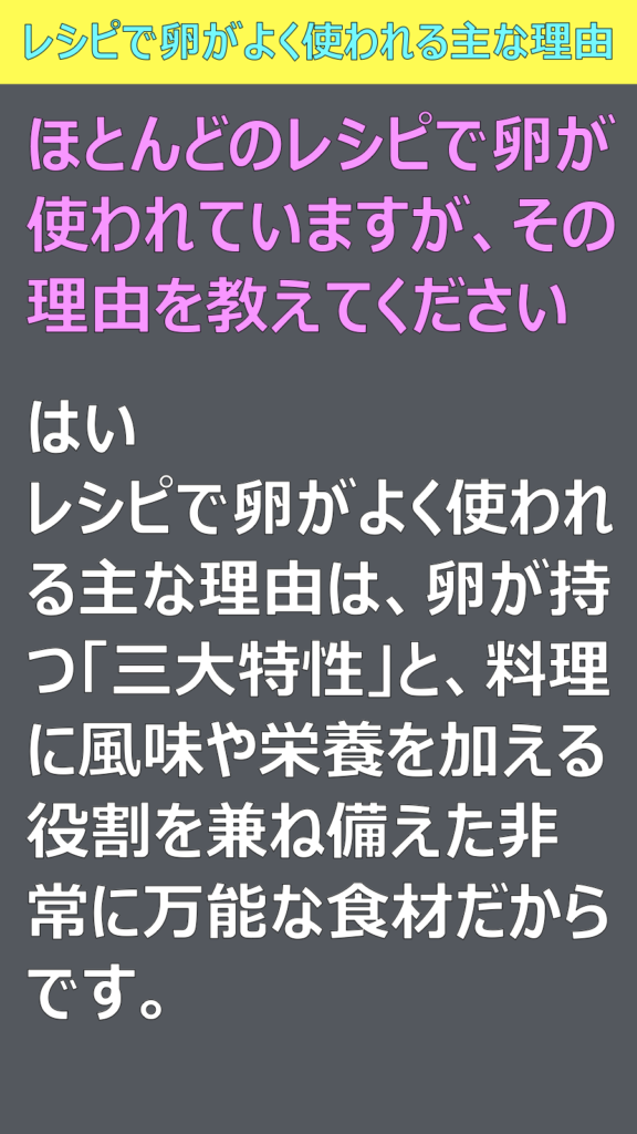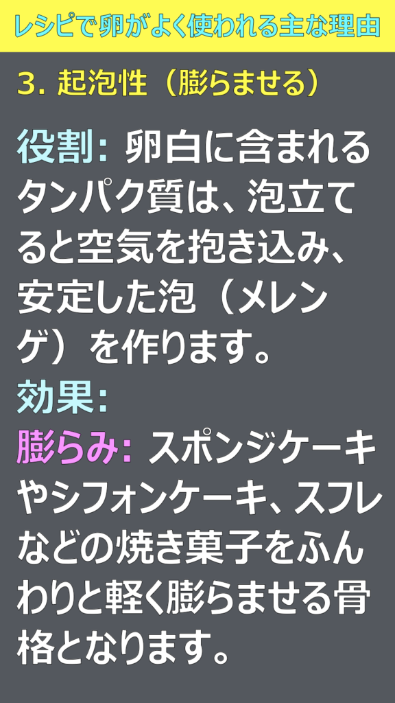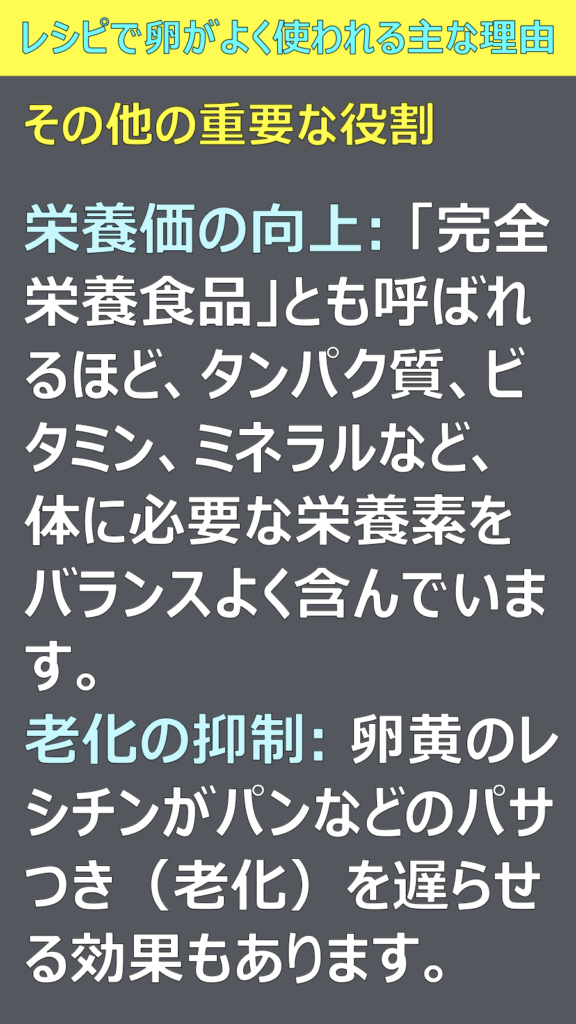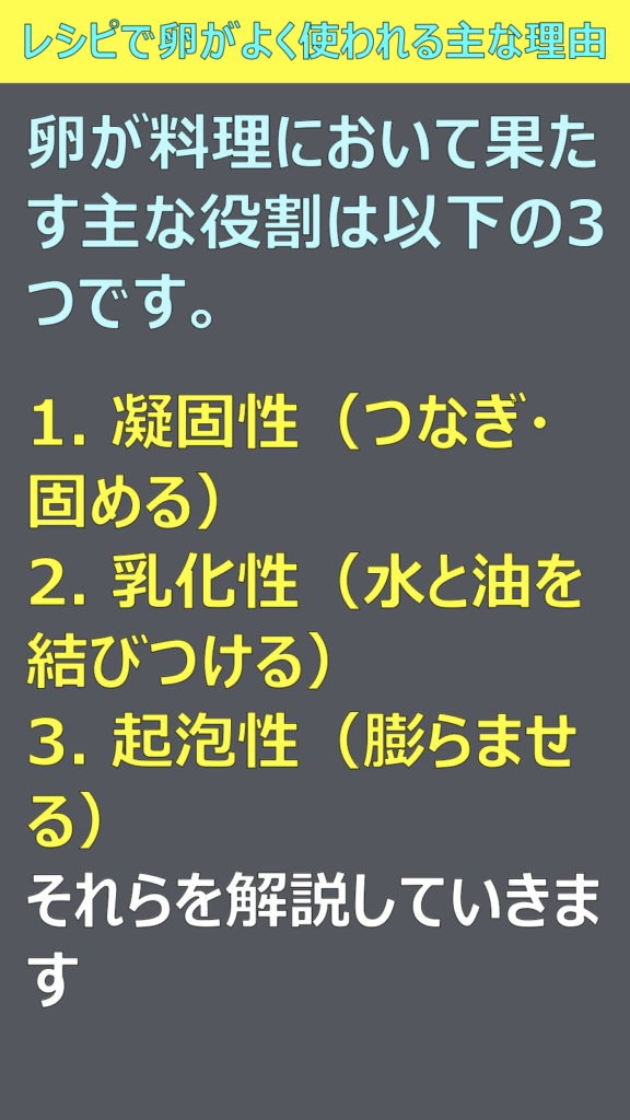 ほとんどのレシピで卵が使われていますが、その理由を教えてください