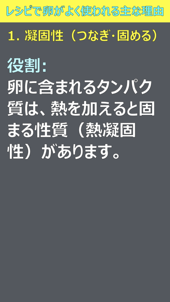 役割: 卵に含まれるタンパク質は、熱を加えると固まる性質(熱凝固性)があります。