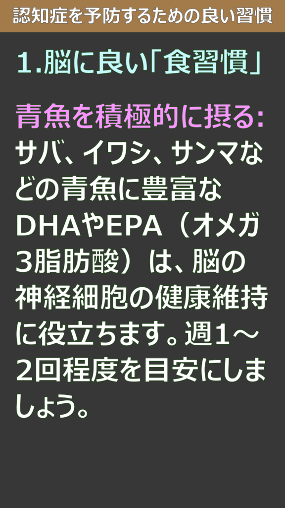 青魚を積極的に摂る:サバ、イワシ、サンマなどの青魚に豊富なDHAやEPA(オメガ3脂肪酸)は、脳の神経細胞の健康維持に役立ちます。週1〜2回程度を目安にしましょう。