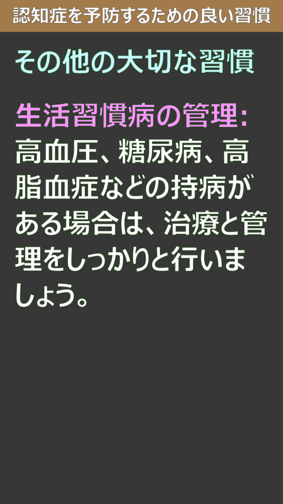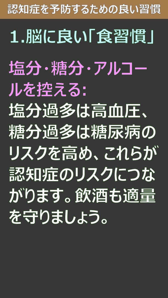 塩分・糖分・アルコールを控える:塩分過多は高血圧、糖分過多は糖尿病のリスクを高め、これらが認知症のリスクにつながります。飲酒も適量を守りましょう。