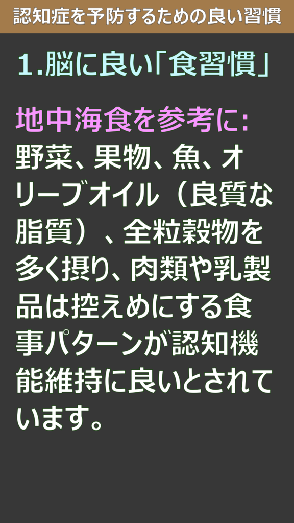地中海食を参考に:野菜、果物、魚、オリーブオイル(良質な脂質)、全粒穀物を多く摂り、肉類や乳製品は控えめにする食事パターンが認知機能維持に良いとされています。