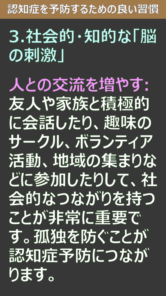 人との交流を増やす:友人や家族と積極的に会話したり、趣味のサークル、ボランティア活動、地域の集まりなどに参加したりして、社会的なつながりを持つことが非常に重要です。孤独を防ぐことが認知症予防につながります。
