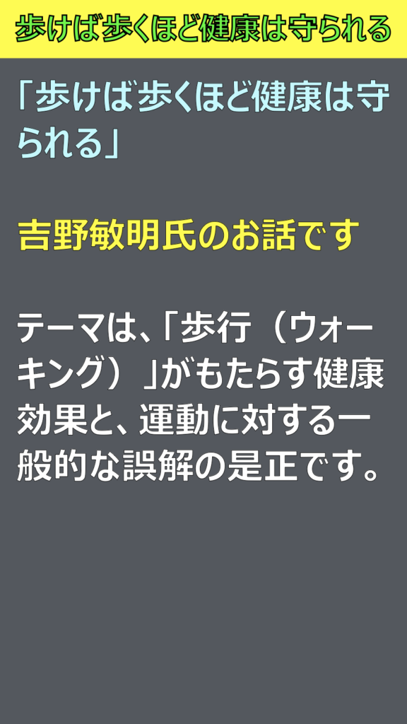 テーマは、「歩行(ウォーキングがもたらす健康効果と、運動に対する一般的な誤解の是正です。